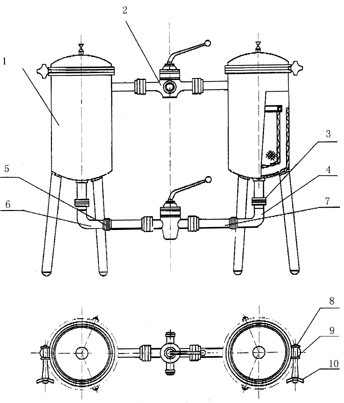 1、φ300过滤器 2、三通外螺纹旋塞 3、圆螺母 4、直角弯管 5、光接头 6、螺纹接头 7、管子 8、棱形螺母 9、接紧螺栓 10、手柄 |