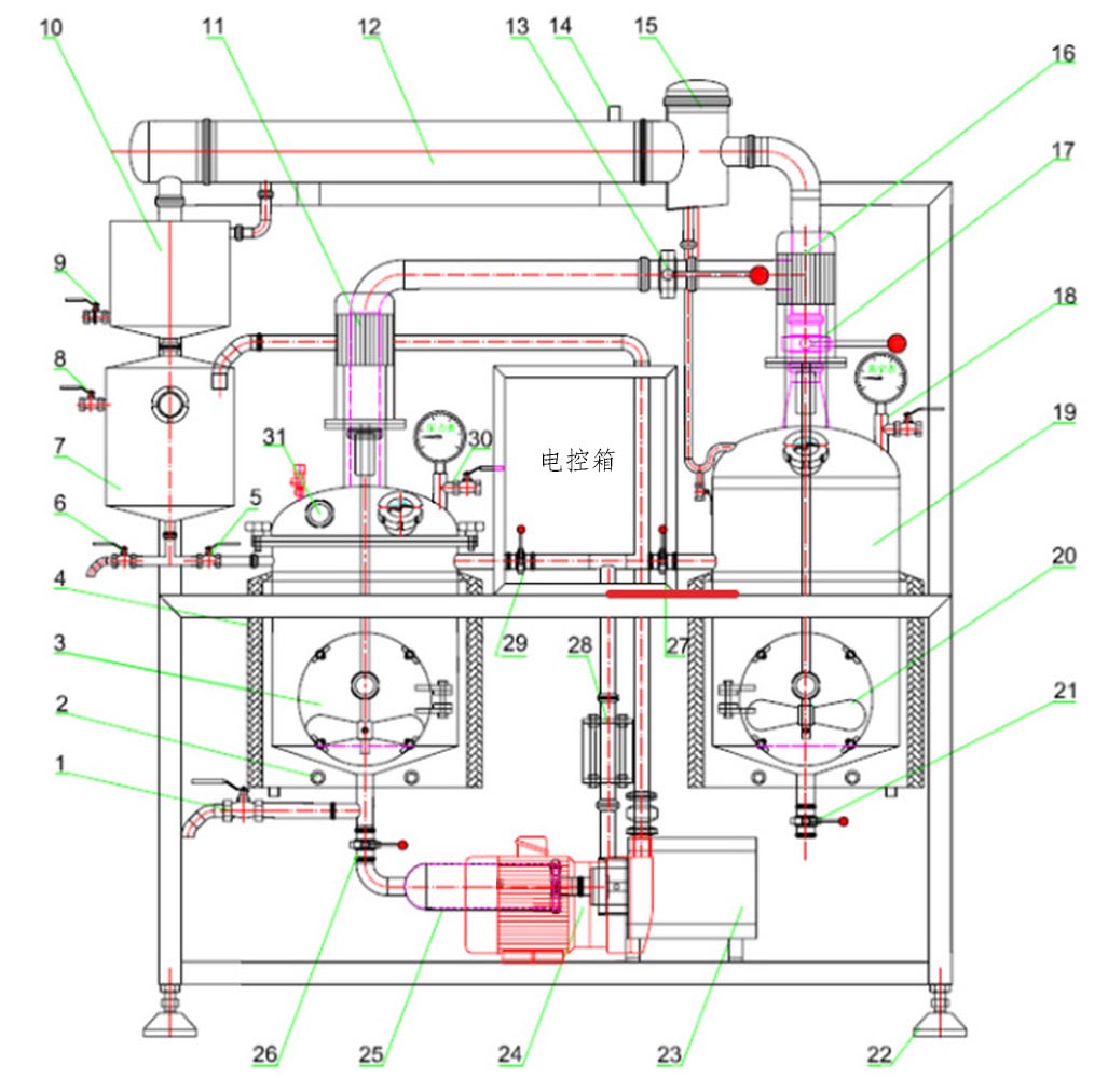 25.管道过滤器; 26.出料阀; 27.浓缩罐进料阀; 28.管路视镜; 29.热回流阀; 30.放气阀; 31.投料口