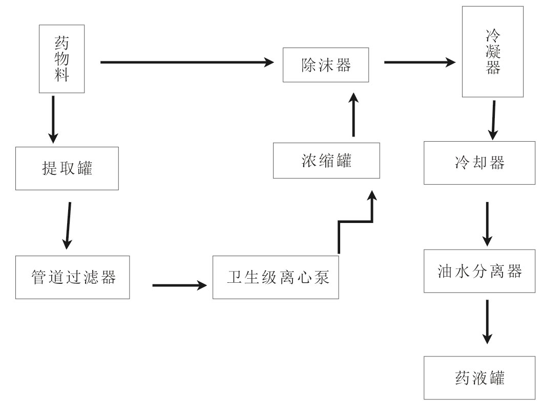 后至过滤器,进入浓缩器。浓缩时产生蒸汽进入冷凝器,成为冷凝液,作为新溶剂喷淋至提取罐同;提取罐内产生的二次蒸汽,经冷凝器冷