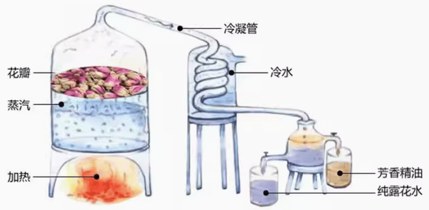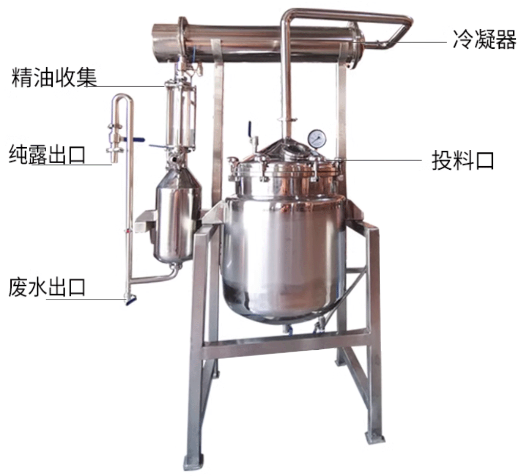 的不锈钢蒸馏容器(蒸馏器),在容器底部加热或通入蒸汽。当炙热的蒸气充满在容器里,会将植物内存的芳香精油成分随着水蒸气蒸发,并且随着水蒸气通过上方
