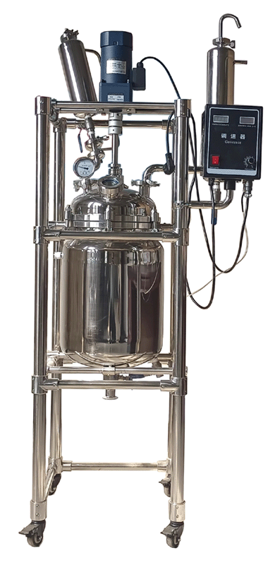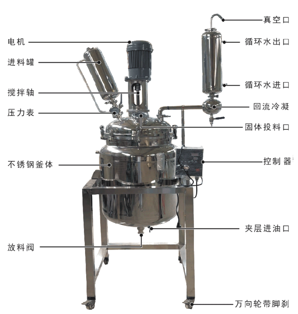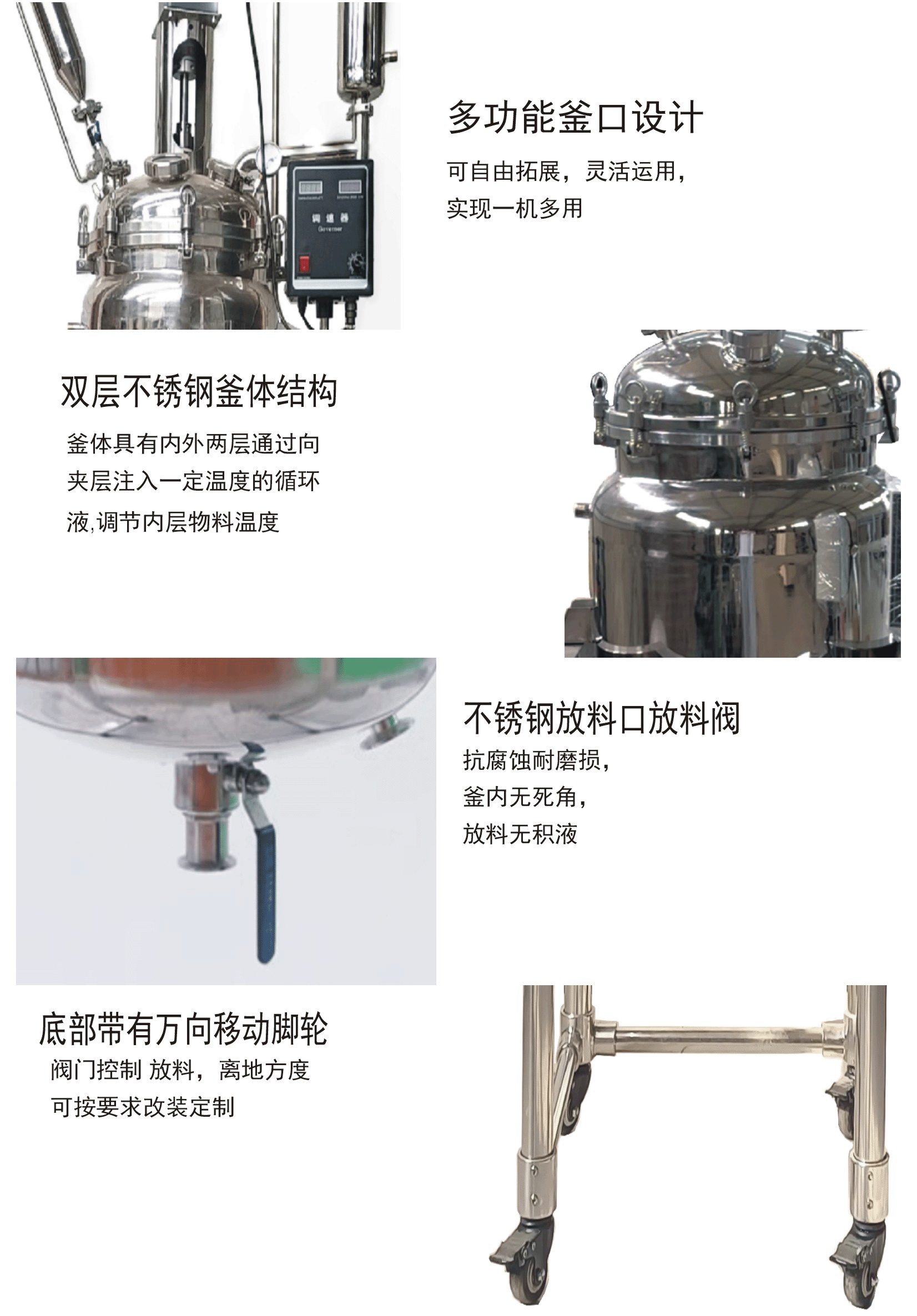 双层不锈钢反应釜为双层不锈钢设计,内层放入反应溶媒可做搅拌反应,夹层通上不同的冷热源(冷冻液,热水或热油)做循环加热或冷却反应。在设定恒温条件下