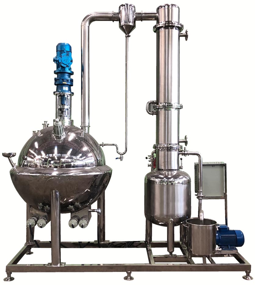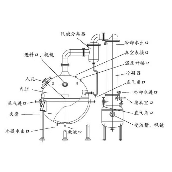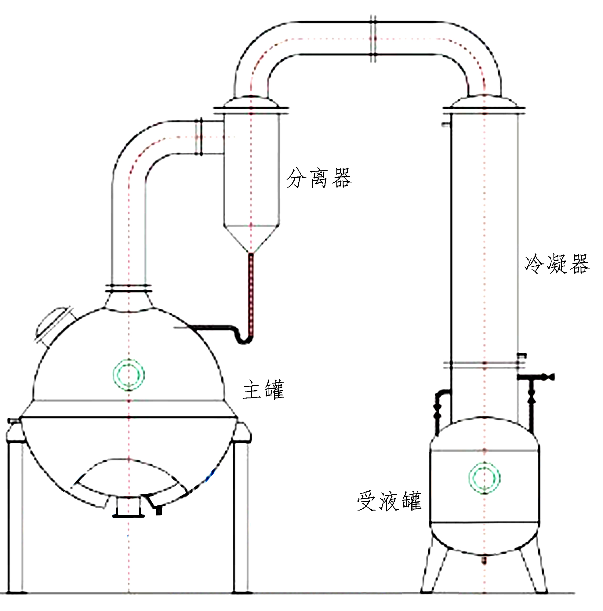 球形浓缩罐主要由浓缩罐主体、冷凝器、气液分离器、受液桶四个部分组成,可用于制药、食品、化工等行业对料液的浓缩、蒸溜及有机溶